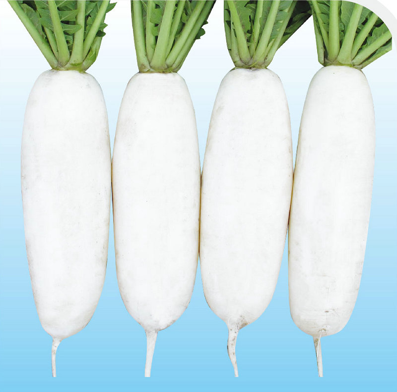 根型好,圆简形,根皮纯白,光滑,有光泽,肉质白,耐裂,不易棘心,根长25-30厘米。板叶品种当中稍耐寒。
